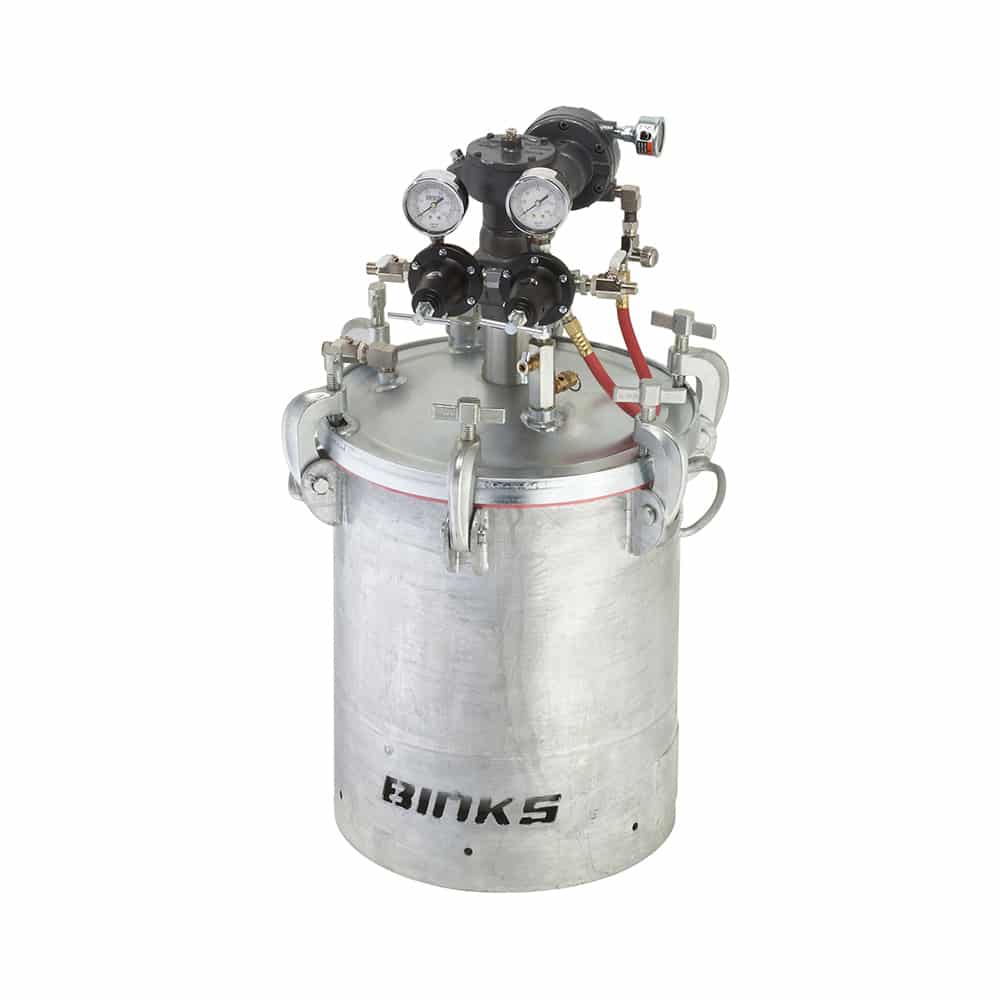 Binks pressure feed containers provide a consistent supply of conditioned coating material, ensuring optimal viscosity and pressure for efficient spray application.