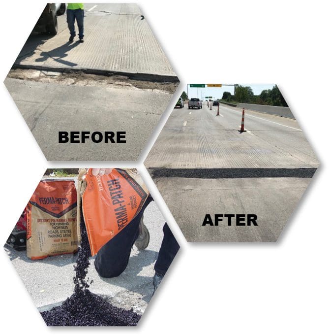 • Works in Standing Water: No need to dry out the hole. Perma-Patch displaces water and bonds directly to the existing surface.