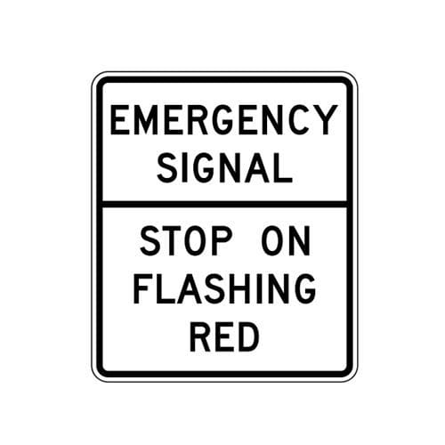The R10-14T sign directs drivers to come to a complete stop when the associated emergency signal beacon is flashing red.