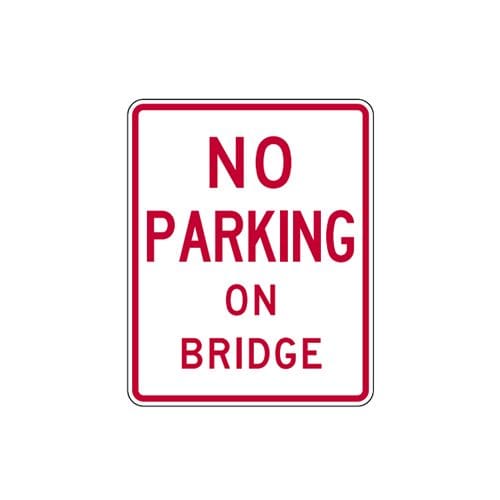 The R8-1aT sign has clear, bold text stating “NO PARKING ON BRIDGE” to communicate to all motorists effectively.