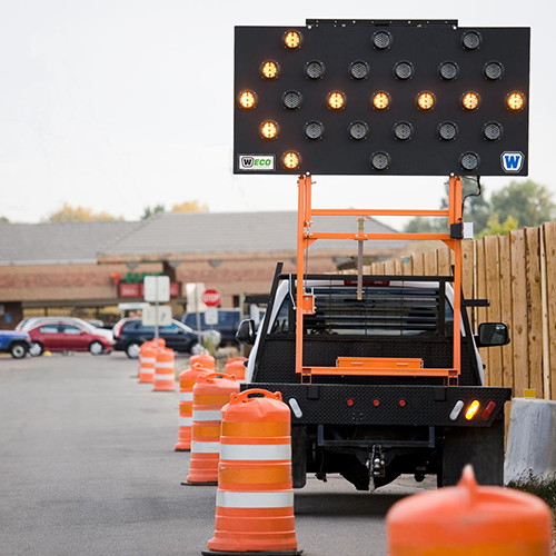 Our Arrow Boards are the industry leaders in power efficiency. They are designed with low power consumption and come equipped with a self-contained power supply. Additionally, they feature a control module with a 30 foot cable, allowing for convenient mounting inside a truck cab or in another location.Â